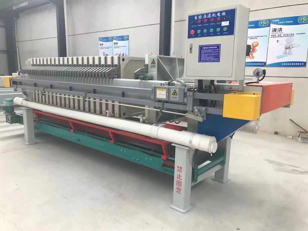 接下來把過濾介質鋪沒在濾板上,料漿通過中心或環狀加料管導入濾板上表面,進行連續過濾。當過濾進行到所要求的濾餅產量或由于濾餅的阻力使過濾速率低到預定值時,過濾過程結束。某些水平板式壓濾機在底部設計了_板。過濾過程結束后,必然有一些殘存料液,可月洗液置換或空氣吹除。洗滌和反吹過程如同加壓葉濾機。卸料時,將濾板組件從殼體內抽出后刮除濾餅。有些壓濾機在適當位置設計了水噴頭用來沖洗濾板。